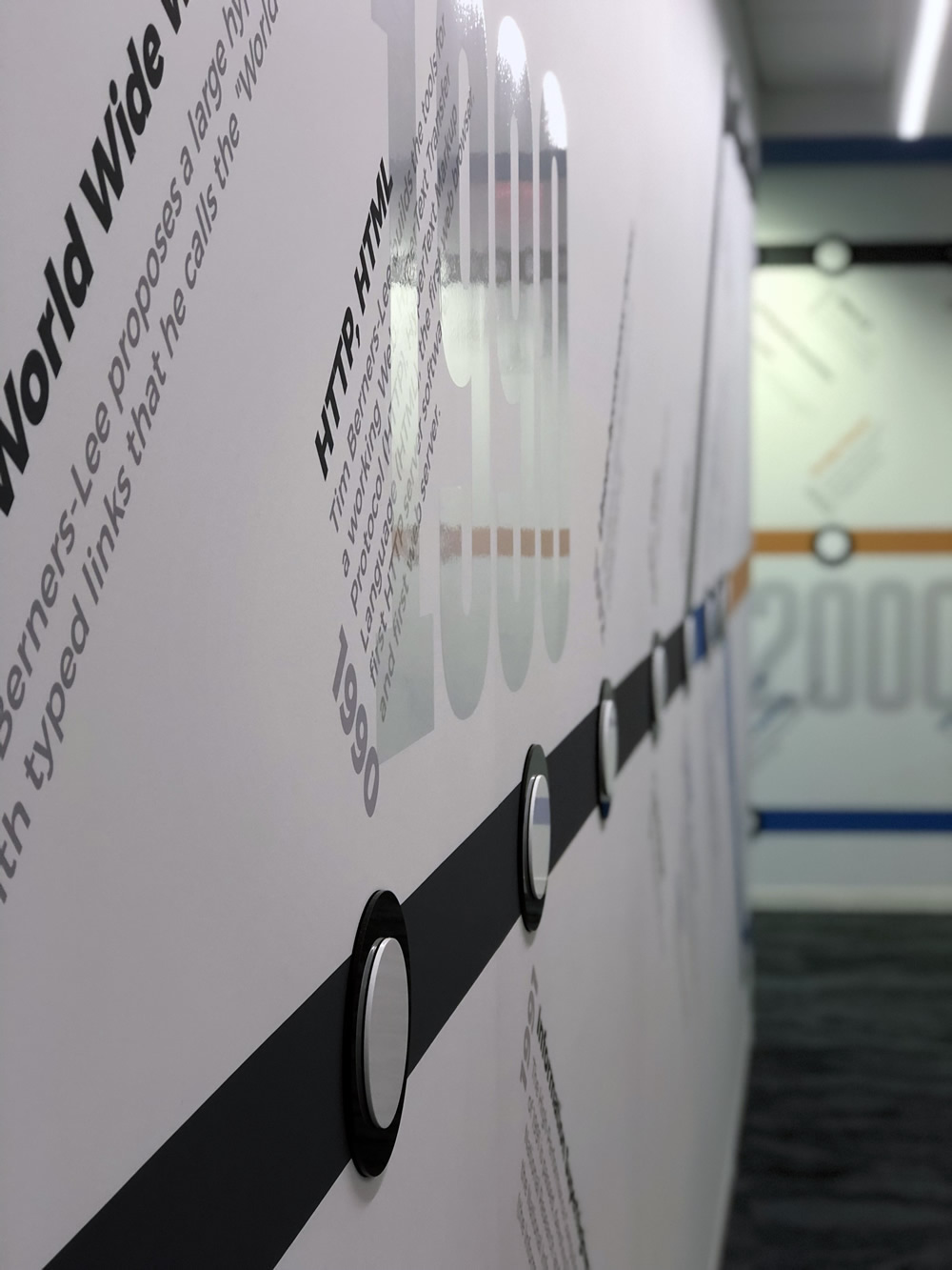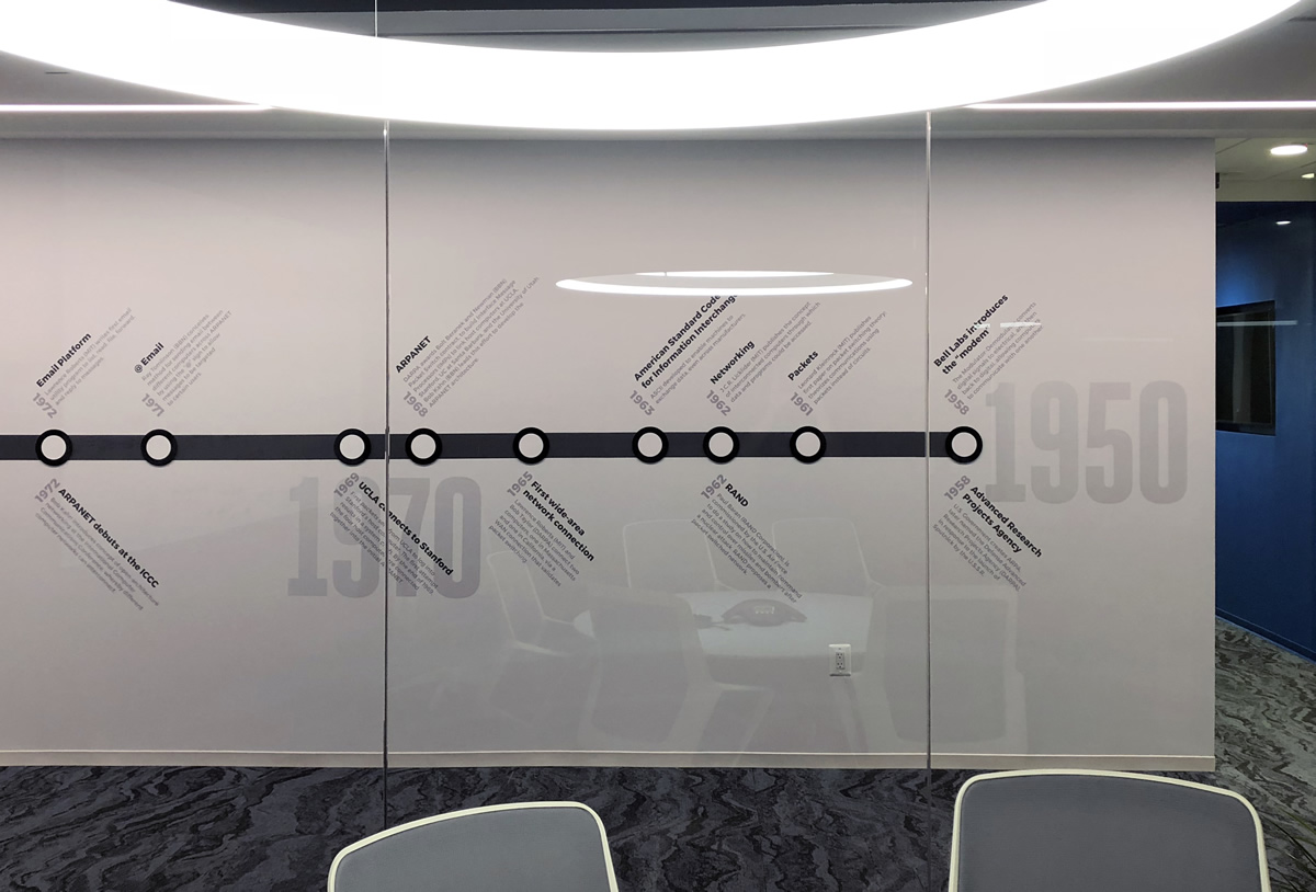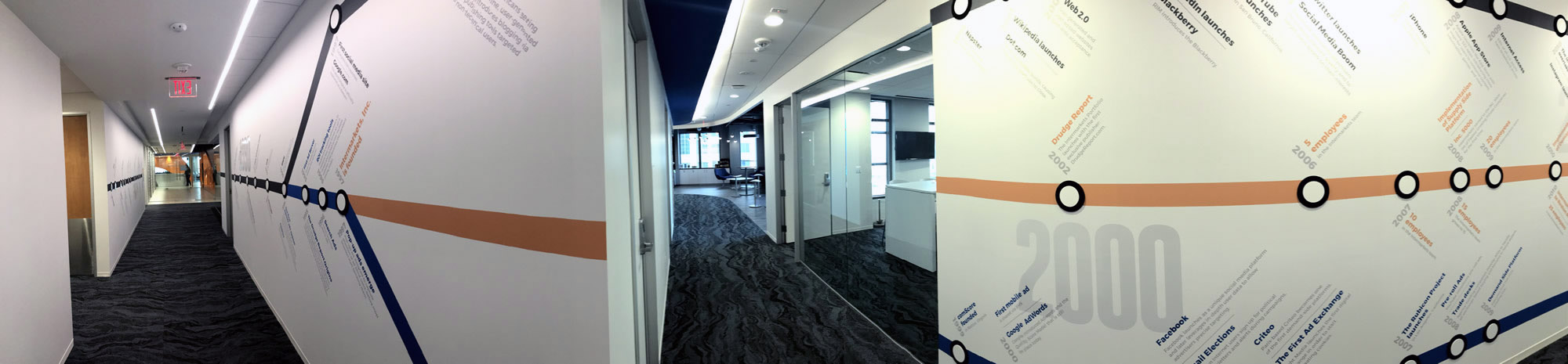 When Intermarkets Inc. decided to move to a new location, I was tasked with creating a timeline of the history of the internet, including online advertising, and company history. Inspired by the Washington D.C. Metro map, the timeline was printed on vinyl spanning three separate walls.